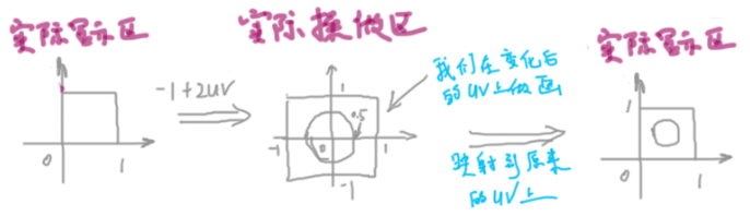 uv = -1.0 + 2.0*uv; // 把原始的uv进行扩展和位移,得到新的uv。我们的操作就是在新的uv上进行的,最终显示时会映射到原来到uv,请参考下图