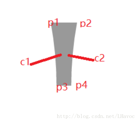 (2)然后c1和c2是分别控制p1到p3、p2到p4的曲线,是贝塞尔曲线的控制点。它们的横坐标对应的是p3,p4的横坐标(相等),纵坐标取两个圆心距离的一半。这样画出这个静态的图片就不难了。