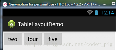 <TableLayout android:id="@+id/TableLayout2" android:layout_width="fill_parent" android:layout_height="wrap_content" android:shrinkColumns="1" > <TableRow> <Button android:layout_width="wrap_content" android:layout_height="wrap_content" android:text="one" /> <Button android:layout_width="wrap_content" android:layout_height="wrap_content" android:text="two" /> <Button android:layout_width="wrap_content" android:layout_height="wrap_content" android:text="three" /> <Button android:layout_width="wrap_content" android:layout_height="wrap_content" android:text="four" /> <Button android:layout_width="wrap_content" android:layout_height="wrap_content" android:text="five" /> <TextView android:layout_width="wrap_content" android:layout_height="wrap_content" android:text="文本XX" /> </TableRow> </TableLayout>