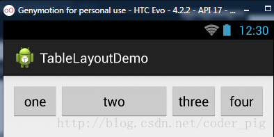 <TableLayout android:id="@+id/TableLayout2" android:layout_width="fill_parent" android:layout_height="wrap_content" android:stretchColumns="1" > <TableRow> <Button android:layout_width="wrap_content" android:layout_height="wrap_content" android:text="one" /> <Button android:layout_width="wrap_content" android:layout_height="wrap_content" android:text="two" /> <Button android:layout_width="wrap_content" android:layout_height="wrap_content" android:text="three" /> <Button android:layout_width="wrap_content" android:layout_height="wrap_content" android:text="four" /> </TableRow> </TableLayout>