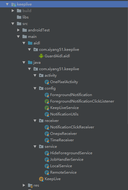 <!--权限配置--> <uses-permission android:name="android.permission.FOREGROUND_SERVICE" /> <uses-permission android:name="android.permission.GET_TASKS" /> <uses-permission android:name="android.permission.REORDER_TASKS" /> <!--保活相关配置--> <receiver android:name="com.xiyang51.keeplive.receiver.NotificationClickReceiver" /> <activity android:name="com.xiyang51.keeplive.activity.OnePixelActivity" /> <service android:name="com.xiyang51.keeplive.service.LocalService" /> <service android:name="com.xiyang51.keeplive.service.HideForegroundService" /> <service android:name="com.xiyang51.keeplive.service.JobHandlerService" android:permission="android.permission.BIND_JOB_SERVICE" /> <service android:name="com.xiyang51.keeplive.service.RemoteService" android:process=":remote" />