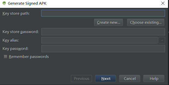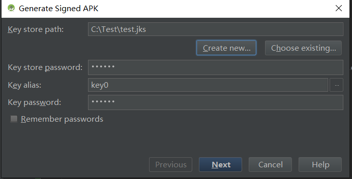 第二步:如果之前有编译成APK的话,就直接选择Choose existing已经存在的key;如果没有编译成APK那就选择Create new创建一个新的key的存放路径,然后填上密码,其中First and Last Name填一下,其他的无所谓。如图