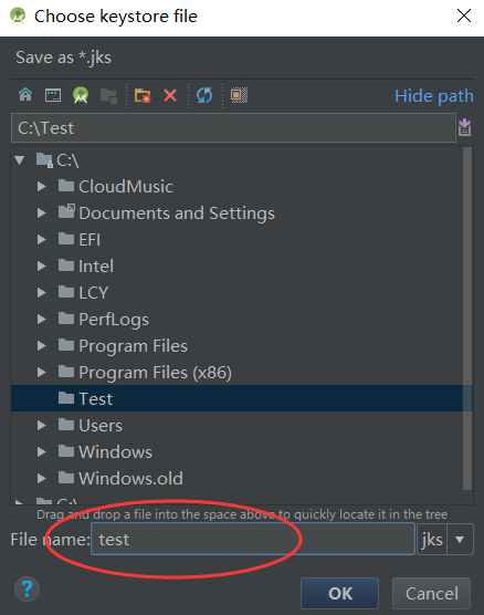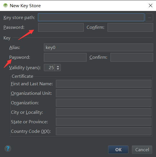 尽量保证图中所指的两处密码相同,这样可以避免混淆,然后点击ok。下图的红圈之内填的是存储key的文件名。