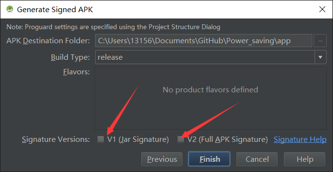接下来,一定要点击下图标记的两个选项,然后点击Finish,最终的APK文件就在下图的路径中。