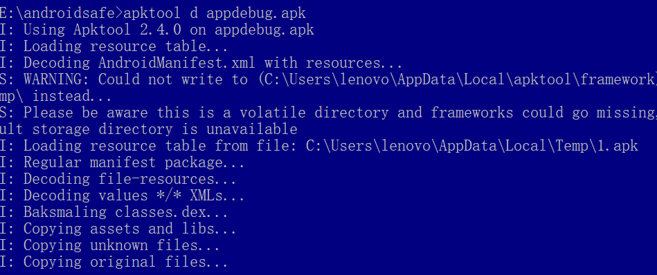 apktool d 您拿到这个文件夹下的需要反编译的apk文件名.apk