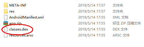 2.解压之后你会在解压之后的文件当中发现一个名为:classes.dex的文件,这样就把apk的dex文件得到啦!如下图所示: