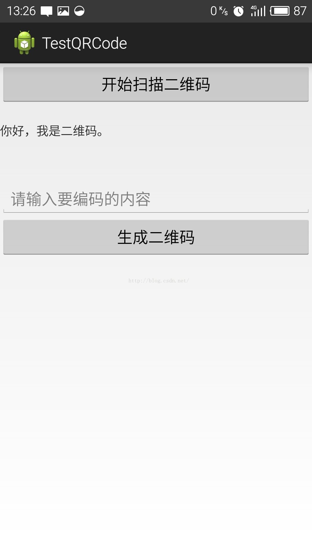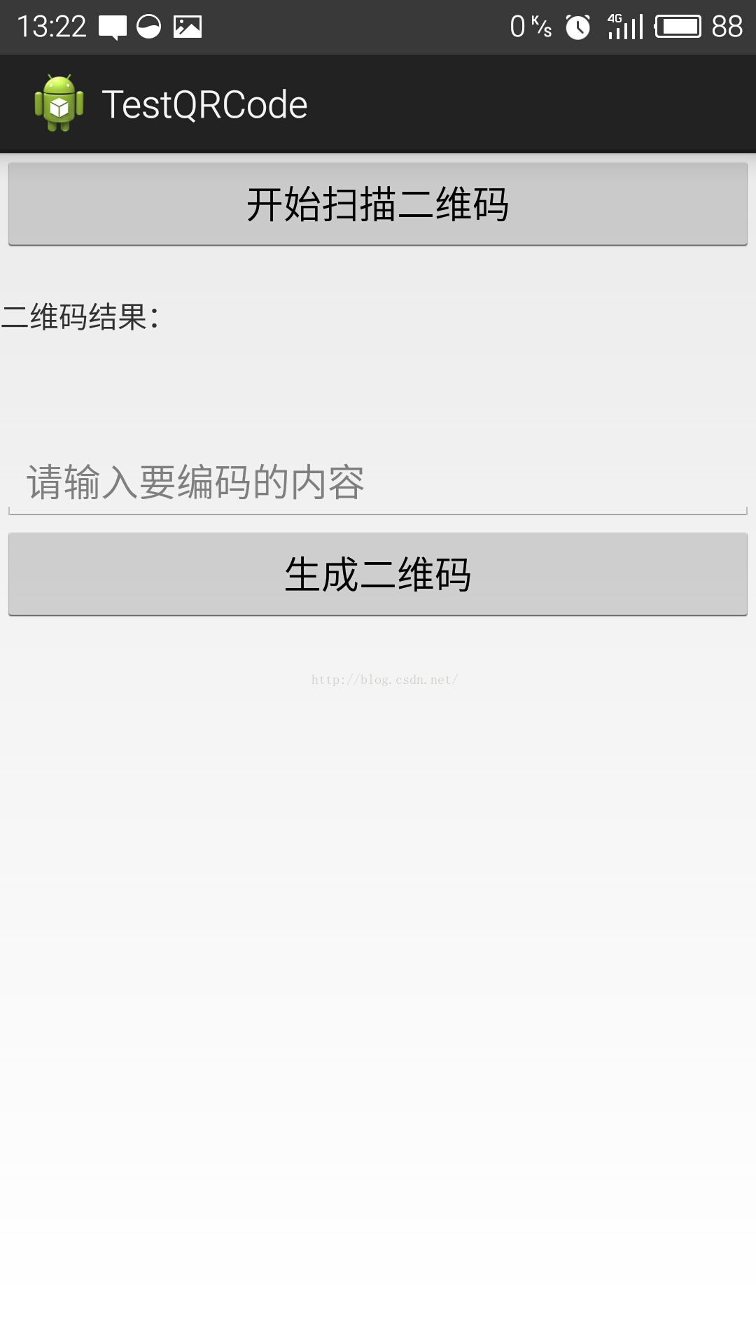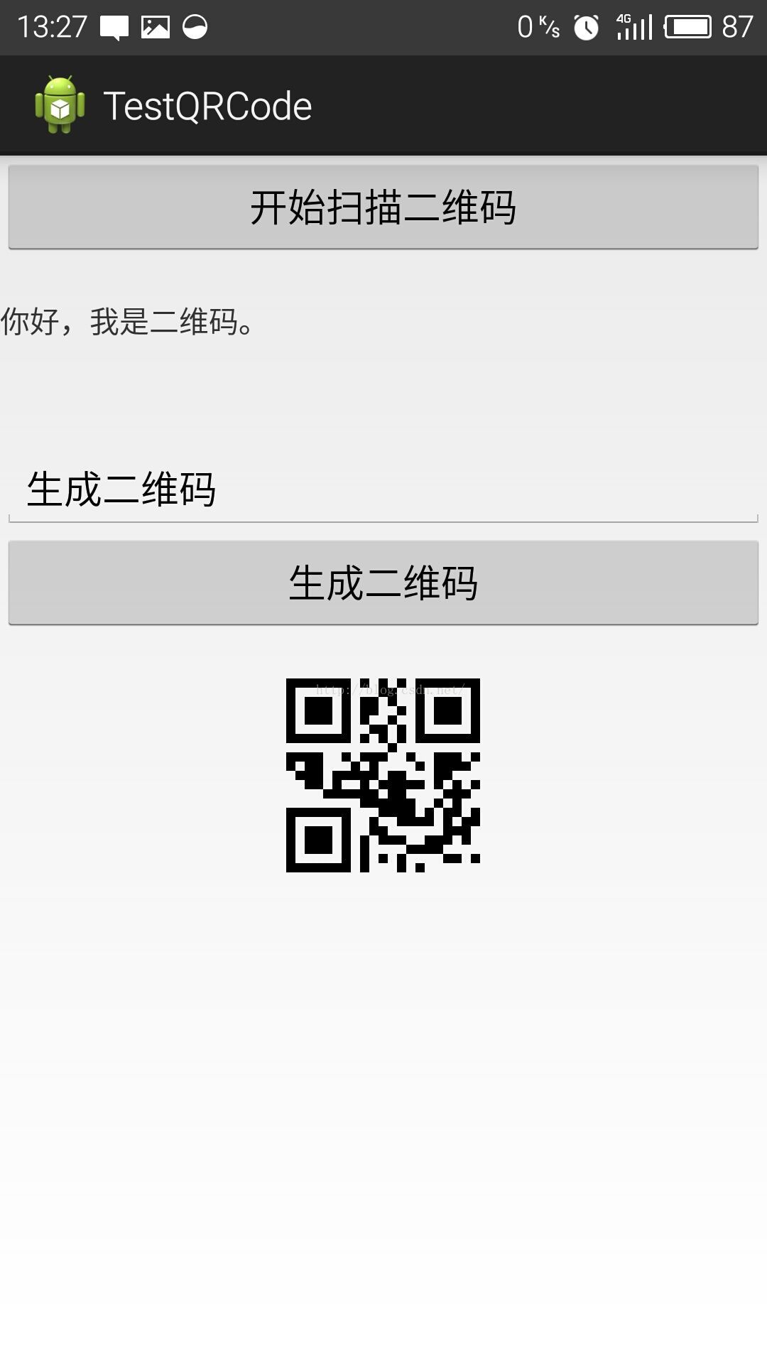 该例子可以扫描二维码和条形码,扫描后会将信息显示到下方的TextView中,在EditText中输入想要生成的文本,点击生成二维码,会在下方显示二维码图片。