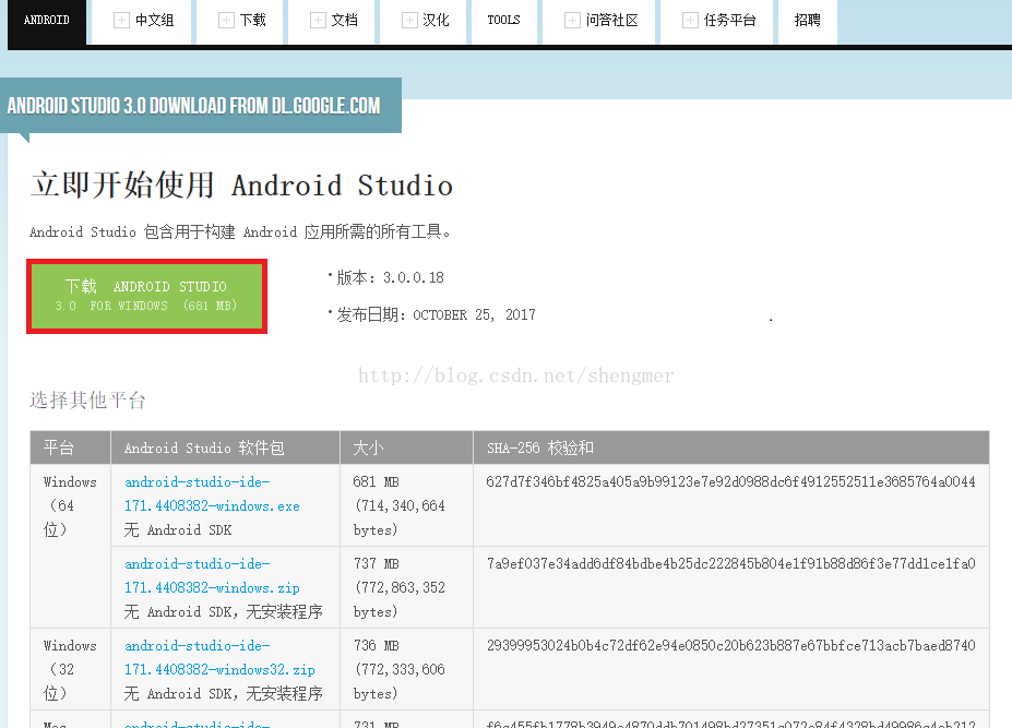 进入界面:如图所示,点击绿色框,下载 ANDROID STUDIO;