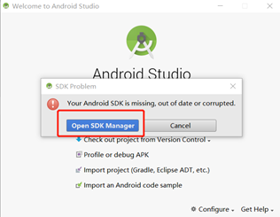 16、因为Android Studio中没有SDK,所以提示SDK丢失,所有我们选择“Open SDK Manager”来设置SDK路径