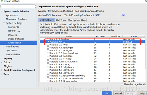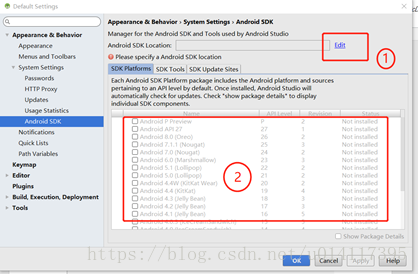 17、在②处,都是灰色的,表示没有SDK,所有点击①“Edit”,在弹出的窗口中选择之前解压好的SDK路径,同样SDK存放路径中不能有汉字。