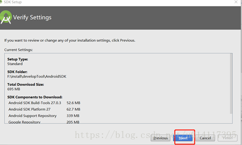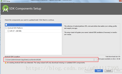 13、提示下载所需的SDK,如果没有SDK点“Finish”进行下载,如果之前已经下载好了,我们直接点“cancel”(如果没有提前下载好的SDK,可以直接点击Finish进行下载,选择在线下载SDK可以忽略第16、17、18步)