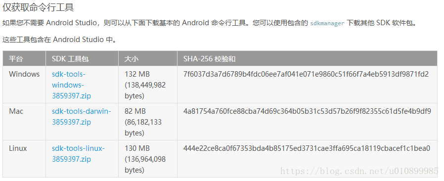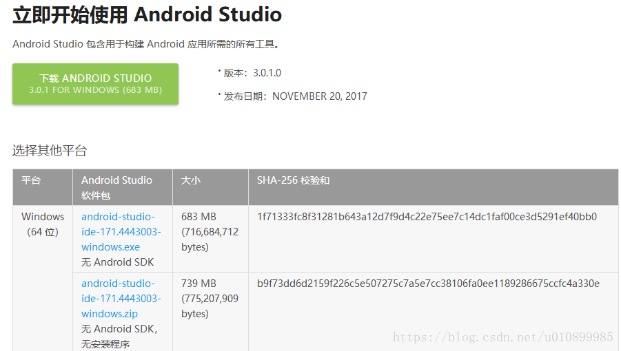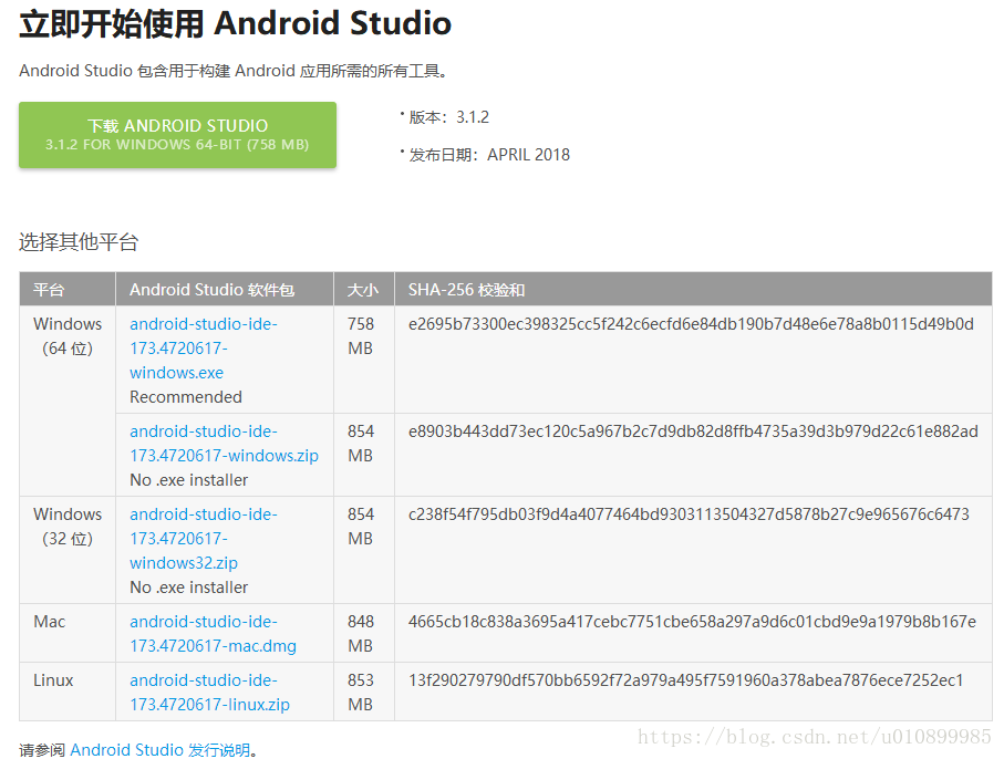 注意:以下 Android Studio 下载链接全是 dl.google.com 开头的官方下载,无需tizi,建议用浏览器直接从官方原始链接下载,不要用迅雷下载、不要用迅雷下载、不要用迅雷下载,重要的事情说三遍,避免类似XCodeGhost的事件!!!