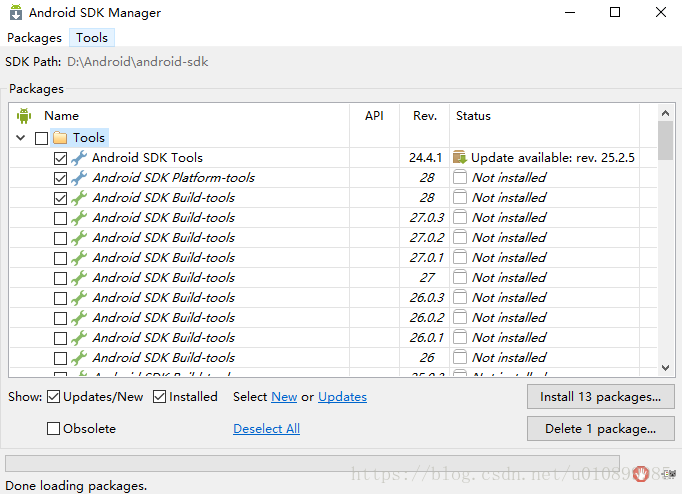 在这里,我们并不是每一个软件都需要下载,而是有选择的,默认的情况下,该Android SDK Manager会包含以下三个下载项: