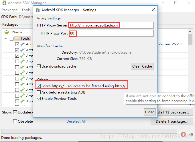 这里配置的镜像服务器地址为大连东软信息学院镜像服务器地址,在配置好镜像服务器地址之后,再勾选图示中的“Force …”选项,然后点击【close】