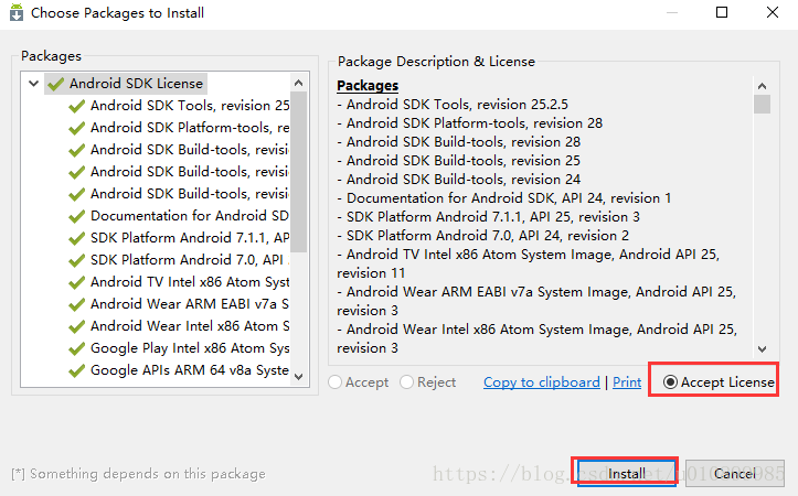 由于我们是采用的安卓模拟器或者手机真机测试(这样模拟器运行速度快),所以说我们不用下载任何系统镜像(System Image),而在选择所要下载的Android版本时,我们推荐选择下载与Build-tools对应的版本。
