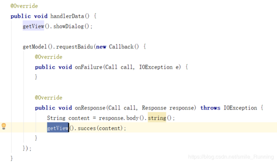 接下来剩余的就是我们的 Model 层了,我们与之对应的是 SecondModel 类,还是请求网络数据,因为我们之前请求的是百度首页的网页文本,为了形成区别,我这里将 URL 改成了我的 博客 地址,哈哈。代码如下: