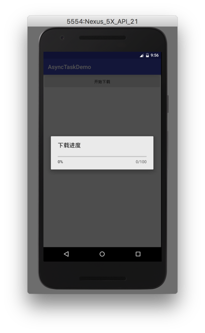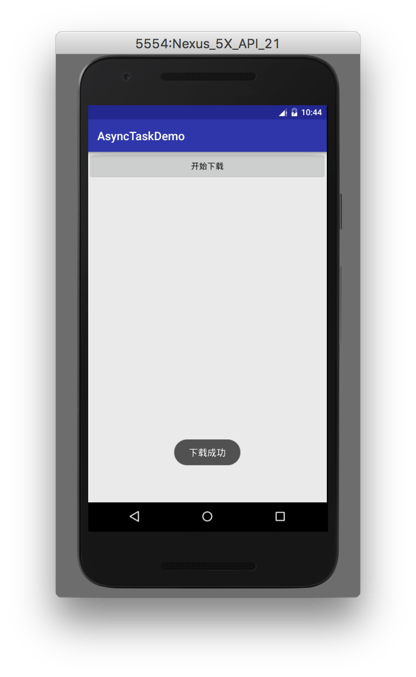 由上面源码可知,它根据msg携带的不同what信息进行不同的消息处理,当what = MESSAGE_POST_RESULT时,最终会执行onCancelled(result)或者onPostExecute(result),这两个方法执行时全部都是在主线程,而MESSAGE_POST_RESULT就是刚刚获取信息时传入的。执行在这里时我们下载事例的代码就走到了onPostExecute(result),我们进行了进度框的隐藏操作,执行的界面如下: