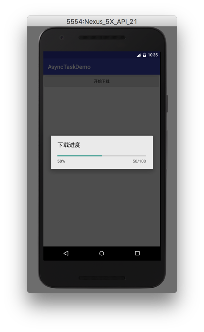 1.在这里我们看到doInBackground(mParams)方法的调用,并且此时仍然是在子线程中,所以在这里可以执行耗时操作。在上面的案例中doInBackground方法里的代码将会执行,当执行到publishProgress()方法时,会不断将进度信息传递给onProgressUpdate()方法(后面的分析中会解释为什么publishProgress()的执行能导致onProgressUpdate()方法的调用),让此方法执行更新UI.执行到这里时,案例中的下载界面如下,此时进度正好走到50%: