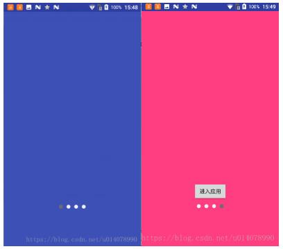 引导页面是由三个控件组成,Viewpager,圆点指示器的线性布局linearlayout, 最后一页的 “进入应用” 按钮。