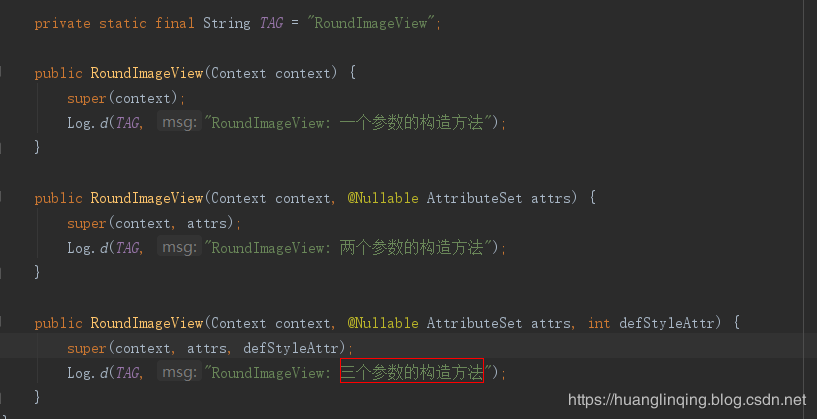 使用自定义View无非就两种情况下,第一种就是直接在xml布局中使用,另一种就是在Activity中new出来,下面我们分别使用上述两种方式,为了便于观察我们在三个构造方法中分别加入一行打印。