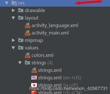 4.最后像这样,然后在里面输入所需要控件的语言,在xml空间中运用到,比如 android:text=“@strings/定义的名字”,注意这4个string里面所有控件的数量与名字都要相同