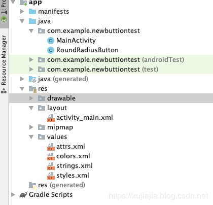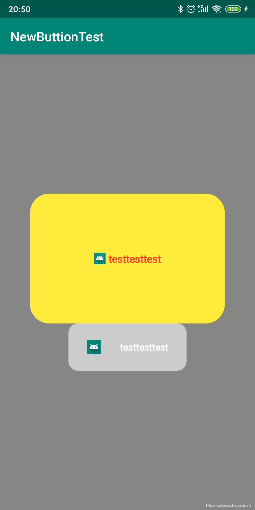 <?xml version="1.0" encoding="utf-8"?> <LinearLayout xmlns:android="http://schemas.android.com/apk/res/android" xmlns:app="http://schemas.android.com/apk/res-auto" xmlns:tools="http://schemas.android.com/tools" android:id="@+id/ll_container" android:layout_width="match_parent" android:layout_height="match_parent" android:background="#868684" android:gravity="center" android:orientation="vertical" tools:context=".MainActivity" > <com.example.newbuttiontest.RoundRadiusButton android:layout_width="300dp" android:layout_height="200dp" app:bgColor="#FFEB3B" app:drawableHeight="18dp" app:drawableWidth="18dp" app:leftDrawable="@mipmap/ic_launcher" app:leftDrawablePaddingRight="5dp" app:roundRadius="30dp" app:textColor="#FF4329" app:textSize="16dip" app:textString="testtesttest" /> </LinearLayout>