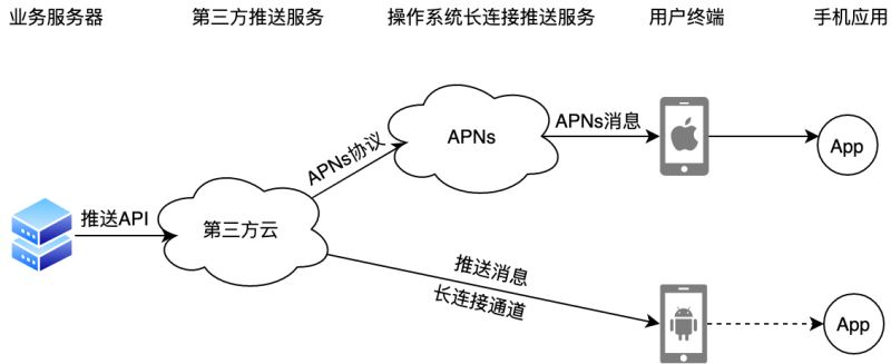 事实上,消息推送是一个横跨业务服务器、第三方推送服务托管厂商、操作系统长连接推送服务、用户终端以及移动手机应用等五方面的复杂业务应用场景。在原生iOS开发中,为了简化消息推送,苹果推送服务(简称APNs)接管了系统所有应用的消息通知需求,任何第三方消息推送都需要经过推送服务进行转发。对于原生Android平台来说,则可以使Google提供的类似Firebase云消息传递机制来实现统一的推送托管服务。