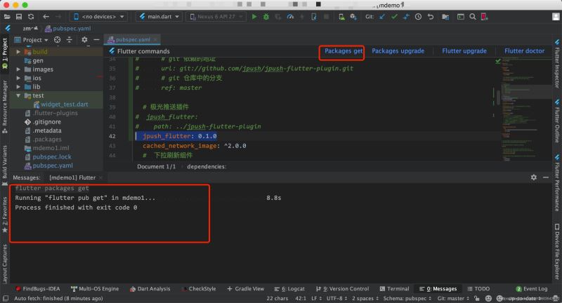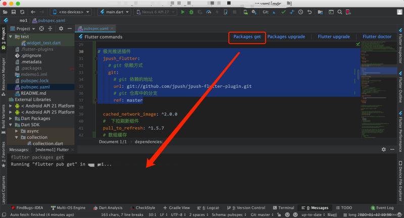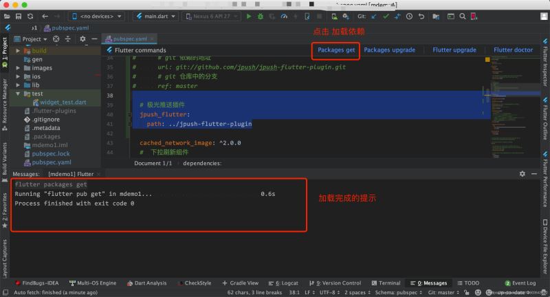 然后,点击 【Packages get 】下载依赖或者直接在terminal 命令行中 使用【 flutter packages get】命令 来加载依赖,如下图所示。