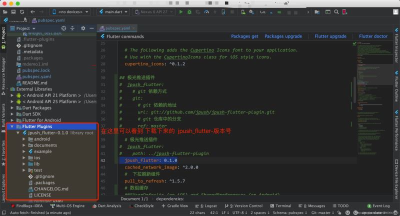 然后在 flutter 项目的 pubspec.yaml 文件中配制极光推送的pub依赖,如下所示。