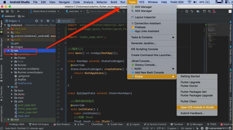 完成上述操作后,极光推送所需的所有原生环境就配置完成了。接下来,使用Android Studio打开Flutter工程,在main.dart文件的initState生命周期函数中添加初始化JPush代码,如下所示。