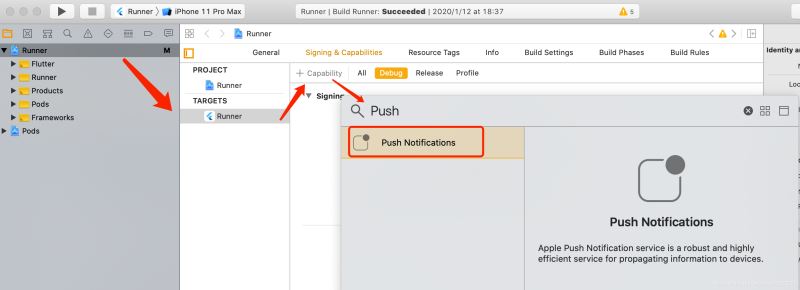 然后,使用Xcode打开Flutter项目的iOS工程,然后依次选择【Target】→【Signing & Capabilities】→【Capability】→【Push Notifications】选项开启应用的消息推送功能,如下图所示。