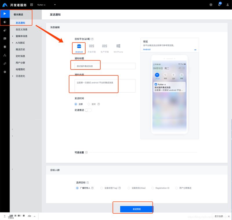 然后,启动Flutter应用,并在打开极光开发者服务后台添加一条推送消息,选择需要推送的平台,然后点击【立即发送】按钮,如下图所示。
