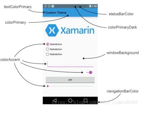 1.colorPrimary 应用的主要色调,actionBar默认使用该颜色,Toolbar导航栏的底色