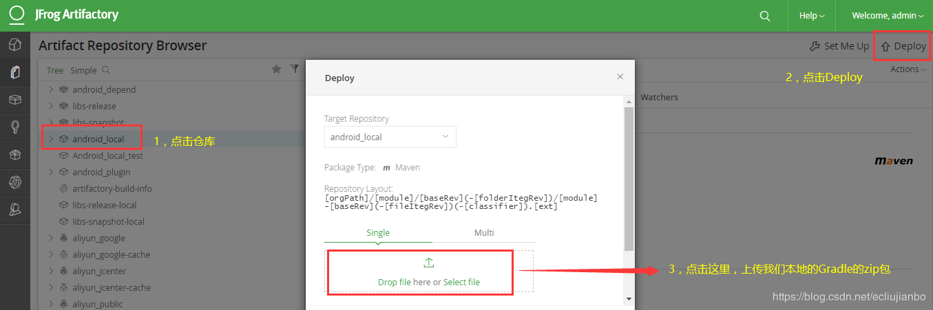 选择,我们的android_local的maven库,点击右侧Deploy,把我们的Gradle的zip上传上去就可以了
