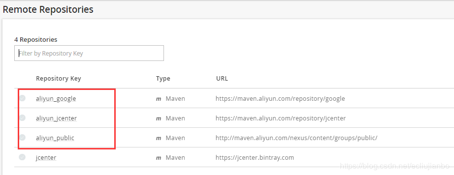 我们填写一个repository key叫aliyun_maven。并填写地址。