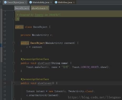 假如我的html里面有两个button控件,第一个我是点击弹一个Toast效果,第二个点击跳转到另一个Activity界面的效果。这里只需要写方法用来在接下来html布局里面调用就可以。需要注意的是这里要在方法上面添加注解@JavascriptInterface,这个方法才能被调用。