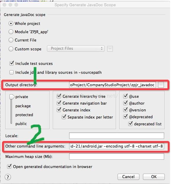 2、在弹出界面中 Output directory是你即将生产的javadoc文件的存储位置,图中1指示的位置;正常点击ok即可;