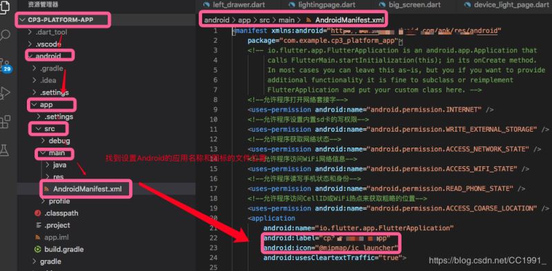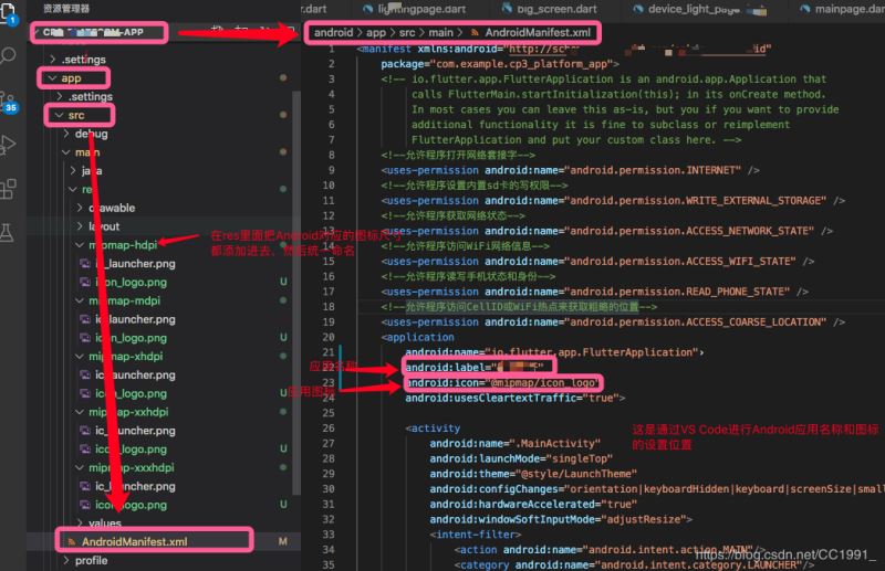 1、首先要定位到修改应用名称的文件,有两种打开方式,第一种方式就是用VS Code编辑器打开项目,然后找到项目里面的Android目录下的Android—>app—>src—>main—>AndroidManifest.xml文件,找到对应的位置进行修改;第二种方式就是打开Android Studio编辑器打开项目里面的Android文件,依然是在app—>src—>main—>AndroidManifest.xml文件中进行修改,具体的操作如下所示: