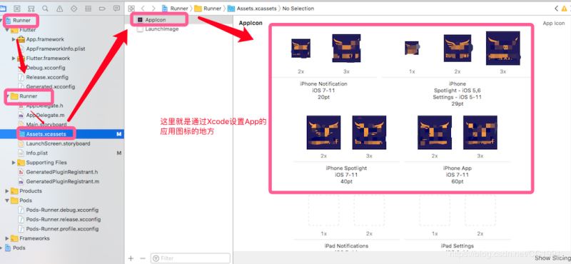 (2)Assets.xcassets文件里面的AppIcon里面对应的就是设置应用图标的地方;