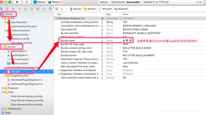 1、由于苹果的icon设置有点特殊,建议开发者直接通过xcode编辑器打开项目的iOS文件夹,然后在xcode编辑器里面进行iOS端的应用图标设置。但是iOS端的应用名称有两种设置方式:第一种就是用VS Code编辑器打开项目,找到iOS目录下的ios—>Runner—>Info.plist文件,然后找到对应的设置应用名称的键值对进行设置;第二种方式就是直接在xcode里面Runner—>Runner—>Info.plist文件里面对应的设置应用名称的键值对进行设置,具体操作如下所示: