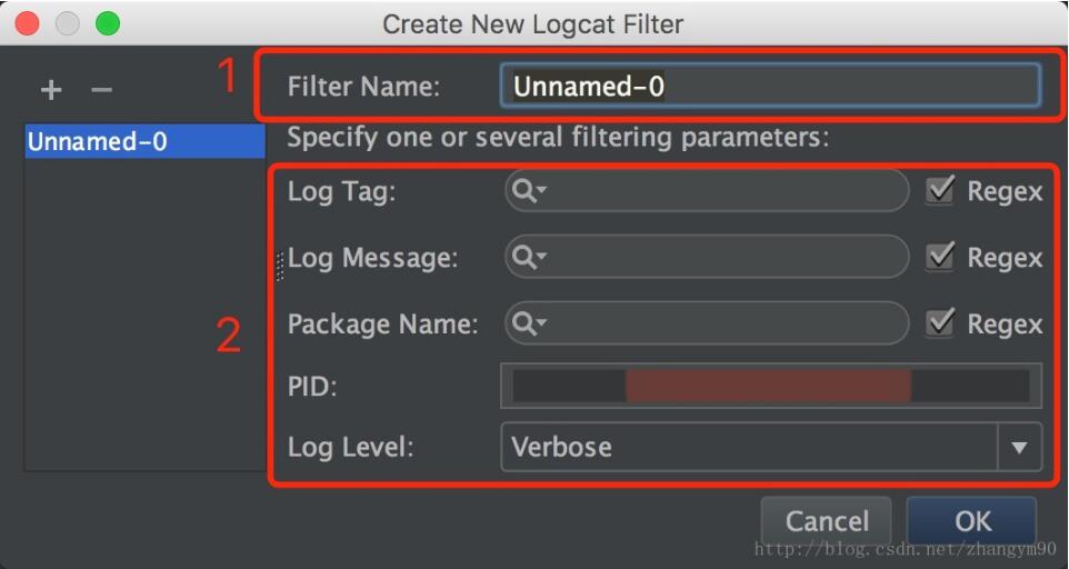 第1部分是为这个过滤器输入名称,第2部分是一些过滤信息的配置:Log Tag 是根据log.d("XXX","show");方法中的XXX参数属性过滤,配置该项之后只会显示日志中Tag为XXX的日志;Log Message是根据日志信息过滤;Package Name是根据包名过滤;Log Level是配置显示日志的级别,一般看自己需求配置;配置完成之后点击OK确认。