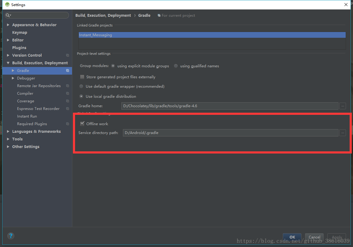 方法二,在Android Studio中修改gradle用户目录,打开设置(快捷键Ctrl+alt+S),定位到Gradle菜单,作如下设置