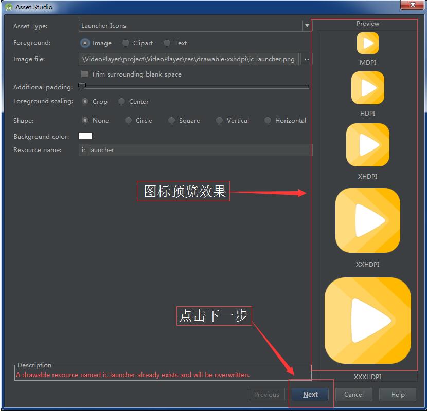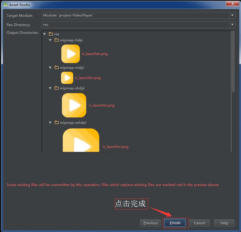 第二步:将自己的图片拷贝进上述几个文件夹,注意:图片名保持一致,而且不要写成ic_launcher.png!!!