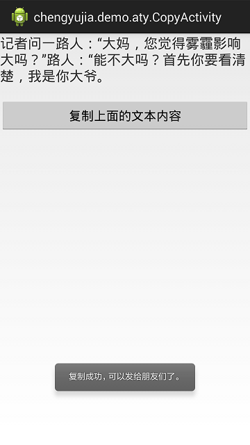 以上这篇Android 复制文本内容到系统剪贴板的最简单实例(分享)就是小编分享给大家的全部内容了,希望能给大家一个参考,也希望大家多多支持脚本之家。