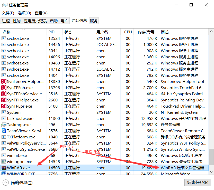 同时,你也可以在进程里面自行查看程序的进程名字和文件描述(即进程描述),既可以在进程里面查看,又可以转到详细信息进行查看。如下图所示: