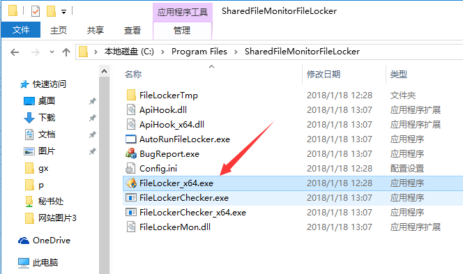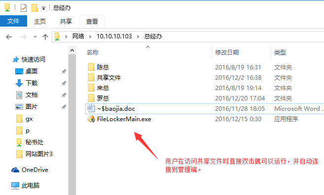 1、可以将客户端软件——FileLockerMain.exe,放到共享文件目录下面,当用户访问共享文件时直接双击运行就可以了。如下图所示: