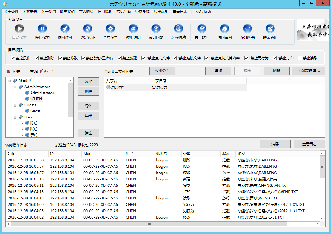 总之,大势至局域网共享文件夹权限设置软件是当前国内首款专门面向服务器共享文件安全管理的软件,可以在操作系统之外提供精细的共享文件权限管理,防止越权访问共享文件的行为,防止共享文件泄密事件的发生。同时,系统提供了全面的共享文件访问日志记录,可以详细记录共享文件的访问时间、动作、访问者的IP地址、MAC地址和登录账户等信息,便于网管事后备查和审计。