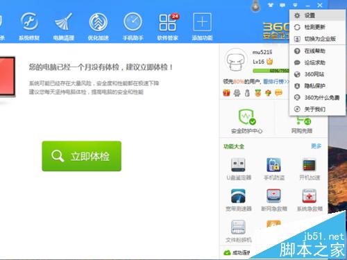 2、我们找到360右上角的一个向下箭头并点击,在出现的下拉菜单中我们选择“设置”选项。