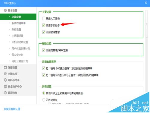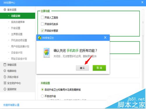 3、在弹出的窗口基本设置-功能定制里的 主要功能框里,我们看到开启手机助手选项,如果这里勾选的话,就证明您安装了360手机助手,那么即使卸载了手机助手,还是会弹出窗口的。