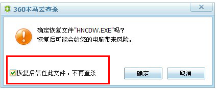再者,如点击立即清除,客户可以在360安全卫士的文件隔离区里找到刚才清除掉的HnzQ.exe,这个时候需要客户重启电脑,点击360安全卫士的文件恢复区对刚才被删除的文件进行文件恢复。见下图,并且把边上的框勾打上,点击确定后关闭360再次运行软件。或将电脑重启,先关闭360安全卫士,然后运行软件。